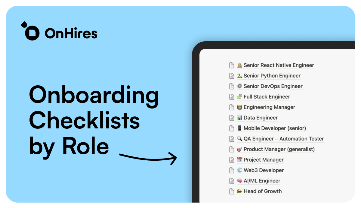 Hiring doesn’t end with an offer. The real impact starts with onboarding — and without a clear structure, even strong hires can take months to ramp up. This library gives you ready-to-use onboarding checklists for key tech roles, designed to bring clarity, alignment, and speed to your hiring process.
