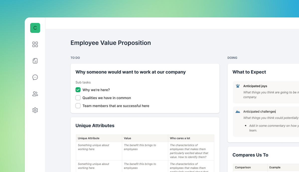 A structured template to define your company’s Employee Value Proposition and clearly communicate why great candidates should choose to work with your team.